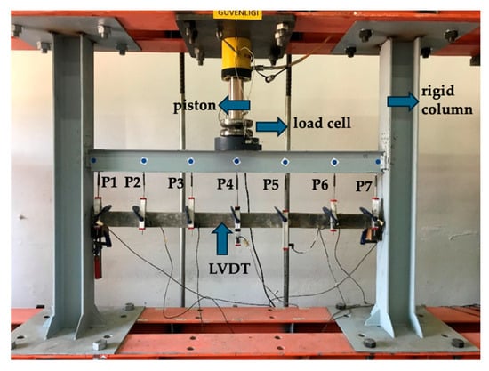 Steel elements reach their limit deflection values at temperatures approximately between 510 °C and 650 °C under normal design loads, and they achieve their mechanical properties when cooled [,]. Therefore, in this study, end plates and bolts were exposed to high temperatures, which were increased to 600 °C with the standard curve. And then the components were heated at 600 °C for 5 h (Figure 2). After the connection elements were cooled, 1800 mm long columns were fixed in the frame, and 1860 mm long beams and connection elements were replaced in every experiment model. Three-point bending tests were performed (Figure 3). During the experiment, a load was applied vertically at the midpoint with a constant speed using a hydraulic loading device with a capacity of 1000 kN. The load was read using a load cell placed between the midpoint of the upper flange of the beam and the loading device (Figure 3). The similar experimental setup has been used in other studies as well [,,,,]. Seven displacement transducers (LVDT) (P1–P7) with scales of 100 and 150 mm were placed on the bottom flange of the beam at the midpoint of the beam and at two equal points between the midpoint and the beam column connection (Figure 3). Thus, vertical displacements in the beam were measured. Data from the displacement transducers and load cell were recorded via a data logger during the experiment. In real time, the load-displacement curve was followed from the monitor in the computer. After reaching the maximum load-bearing capacity of the beam, the condition of the beam was kept under observation in the real time. The experiment was ended when the deformation or failure of the beam, or an increase in the deflection of the beam, occurred without the beam falling onto displacement transducers.