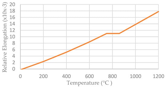 In EC-3, the degradation of mechanical properties such as elastic modulus, yield strength, and thermal properties such as thermal conductivity and specific heat with temperature is detailed. Therefore, reduction factors used to plot stress–strain curves of steel at elevated temperatures are shown in Table 3. The thermal properties of steel have been appropriately calculated according to Eurocode-3 for every different temperature level. The unit volume weight of steel is taken as 10 kg/m3, independent of temperature. In accordance with EC-3 [], the values of specific heat, thermal conductivity and relative thermal elongation of steel are shown in Figure 6, Figure 7 and Figure 8, respectively. At elevated temperatures, the material properties of beams, columns, and plates have been reduced according to the material reduction factors specified in Eurocode-3. The mechanical properties of bolts are also weakened by heat exposure, similar to plates. Studies have been conducted in the literature regarding the reduction factors to be used for bolts []. So, for the bolt, the reduction factor is taken as 0.22, based on Kirby’s study.