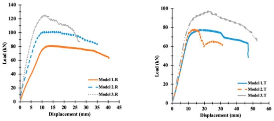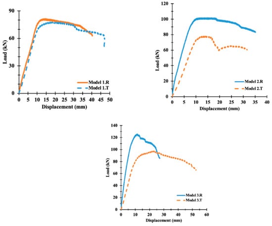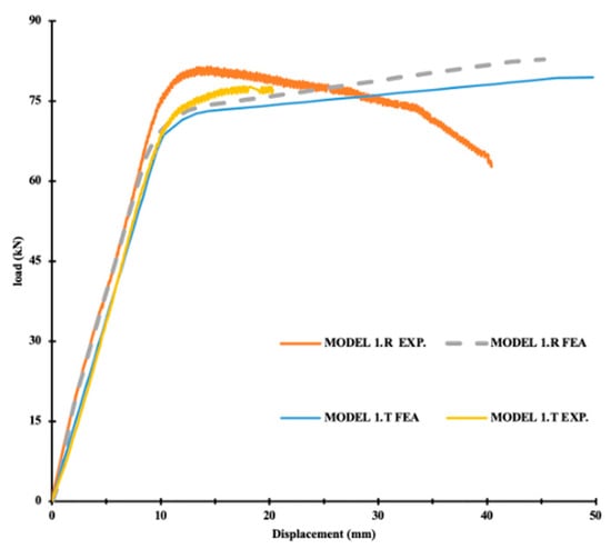 The load–displacement curves in the experiments were compared with the load–displacement curves from the numerical analysis (Figure 13). In all numerical analysis, similar vertical displacement was obtained in the similar maximum load values (Table 7).