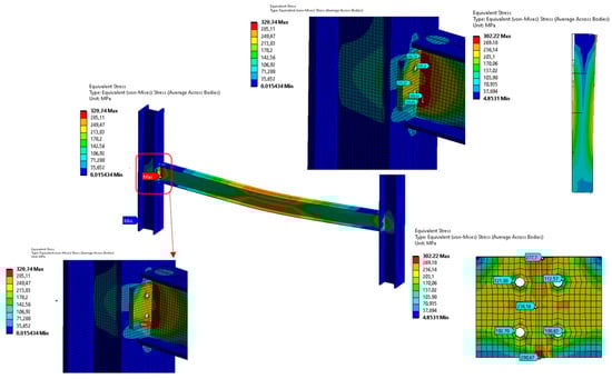 The end plates started to deform at lower stress values depending on the heat. Deformation did not occur in the end plate until the stress reached a value of 165 MPa at room temperature in the model where the end plate is smaller than the beam depth. However, when the connection parts were heated, deformation started in the end plate under a stress of 56.15 MPa. In all models, the end plates began to deform at lower stress values because of the heat (Figure 16).