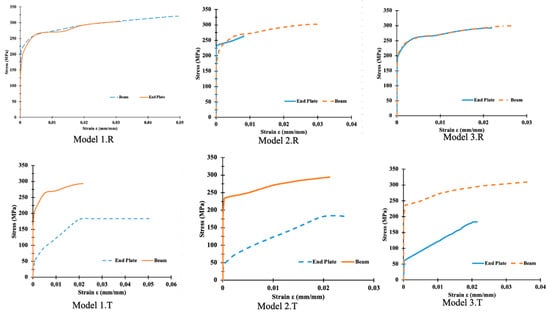 The end plate experienced more unit deformation under the effect of the heat at lower stresses compared to the beam. After reaching the maximum stress with heat, the end plate continued to deform under the same stress until the analysis ended—this is the general behavior. For example, in Model 1.T, the end plate reached the maximum stress at a unit deformation of 0.020 mm/mm and then continued to deform under the same stress up to a value of 0.051 mm/mm (Figure 16).
