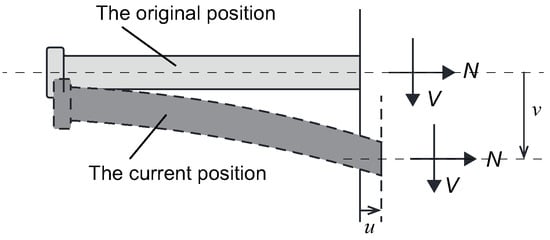 Positioned at the intersection between the steel beam and concrete slab, the stud connector is subjected to diverse permutations of vertical and horizontal movements under the simultaneous impacts of shear and tension, subsequently engendering a complex stress state. The meticulously defined macroscopic elastoplastic constitutive model successfully captures the response of the stud connection through defining the relationship between the force vector, denoted as , and the relative interface displacement vector, denoted as . This relationship, designated in-plane, is hereinafter referred to as the load–displacement correlation. The definitions of and imply that the composite response of both the stud connector and the adjoining reinforced concrete are implicitly encapsulated within the model. This observation further dictates that any variations—be they material properties or geometrical nuances—within either constituent of the stud connection exert a significant influence on the parameters of this model. The directions of the net positive force and the consequent relative displacement at the steel–concrete interface resulting from the forward force can be inspected in Figure 1. Given this backdrop, it is indeed pertinent to define and in the following manner: