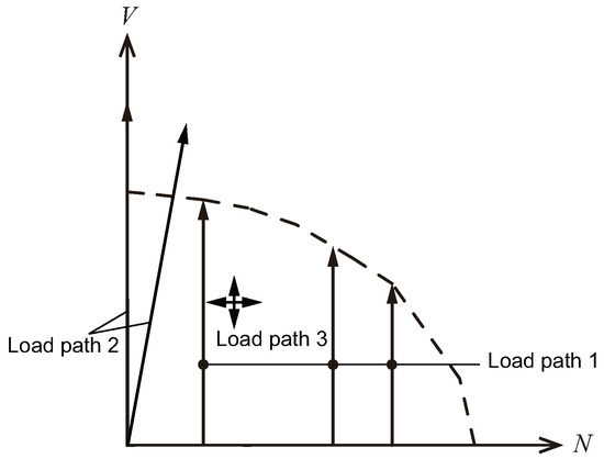 - Load path 2: radial loading. These loading trajectories inform the hardening principle as well as the flow rule characteristic of the elastoplastic model. The instance of pure shear loading does indeed represent a specific case within this load path, from which the shear–slip hardening principle applicable to the stud connection can be extrapolated;