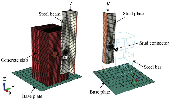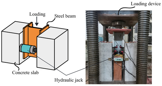 To this end, a series of push-out tests on stud connections were conducted, using the test setup depicted in Figure 3. The employed configuration incorporated a hydraulic jack positioned between the concrete slabs designated to impose tensile stress upon the stud connections, extending along with a separate jack linked to the reaction frame to exert shear forces. The mutable parameters within the push-out test specimens included the elastic modulus of the concrete, the diameter of the stud, and the intensity of the applied tensile force onto the stud. The shear–slip curve under different tensile forces was thus obtained through these tests for the stud connections. Subsequently, a finite element modeling approach was implemented to simulate the push-out tests under shear load for the stud connections, using the finite element model shown in Figure 4. The finite element method empowered us to imitate a broader spectrum of loading paths and engage in parametric analysis. This occasioned an intensive exploration into the ramifications of variables such as the length and diameter of the stud, the elastic modulus of both the concrete slab and the stud, and the volume ratio of reinforcement. Whilst a summary of the elastoplastic model is present, a more comprehensive breakdown of the push-out tests and the finite element models is available in the cited work [41].