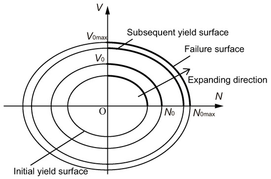 The demarcation between the purely elastic and the combined elastic–plastic states is referred to as the yield surface. Specifically identifying the first transition from an elastic to an elastoplastic state, the defined yield surface can be called the initial yield surface for the stud connection. As the loading process progresses, this initial yield surface undergoes a constant expansion, generating what can then be described as the subsequent yield surface. Bringing this process to conclusion, when the connection attains its point of failure, the yield surface present at that juncture is coined the failure surface. Figure 5 provides a graphic representation of these stages, displaying schematic outlines of the initial yield surface, the subsequent one, and, ultimately, the failure surface. Regarding the shape of the failure surface, established experimental data and data from finite element simulations [42,43,44,45] have collectively affirmed that it approximates to the envelope of a convex arch. On this evidence, we can represent the failure surface through an equation that captures the form of such a convex envelope.