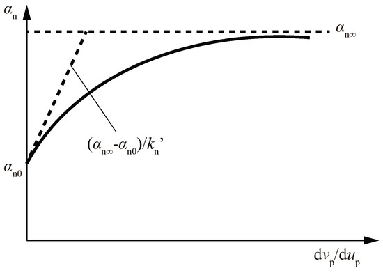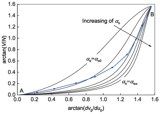 The ideal values of fluctuate in accordance with the varying ratios of plastic displacement iterations . To uphold the flow rule’s consistency across an assortment of values, this nuance must be carefully addressed. To accurately emulate this dynamic, an escalation in is required as increases, highlighting an intensified degree of non-associated flow. One can chart the fluctuation pattern of employing hyperbolic functions. In this context, the plastic displacement iteration , as observed in the shear direction, is rendered normalized by the corresponding plastic displacement iteration within the tensile direction: