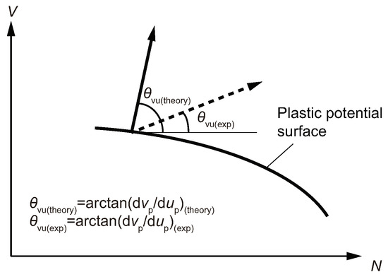 If the load increment remains entirely within the yield surface, the elastic displacement can be determined using Equation (3). Upon yielding, the increment vector of plastic displacement, , is oriented perpendicularly to the plastic potential surface. The magnitude of the plastic displacement increment, , is defined by the scaling factor ,