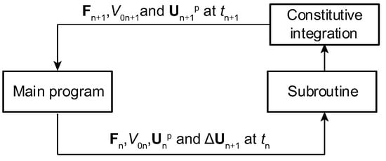 The elastoplastic behavior of stud connections can be represented through integration with a macroelement, which directly delineates the force–displacement interactions specific to stud connections. This macroelement can be effortlessly integrated into the comprehensive finite element analysis of the structure as a cohesive component. To aid in the customization of macroelement characteristics, Abaqus offers a User Element Subroutine (UEL) [46]. The load–displacement curve of the elastoplastic model is encapsulated within this user-defined subroutine. The initial load and the plastic state variable at time are passed to the subroutine by the primary analysis program. Upon receiving the displacement increment , the subroutine is tasked with computing the subsequent load and plastic state variable at the conclusion of the interval using the constitutive integral method, and then relaying these results back to the main program. This symbiotic exchange between the main program and the subroutine is graphically represented in Figure 9.