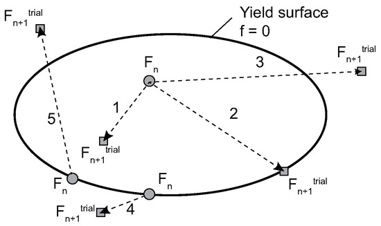 This phase is commonly referred to as the elasticity prediction since the trial load is derived, presuming solely elastic behavior. Within each incremental step, the trial load is assessed, utilizing either the pure elastic or elastoplastic formulation depending on the load step’s termination condition. Five potential scenarios (depicted in Figure 10) are employed to establish the position of the loading state in relation to the currently defined yield surface: