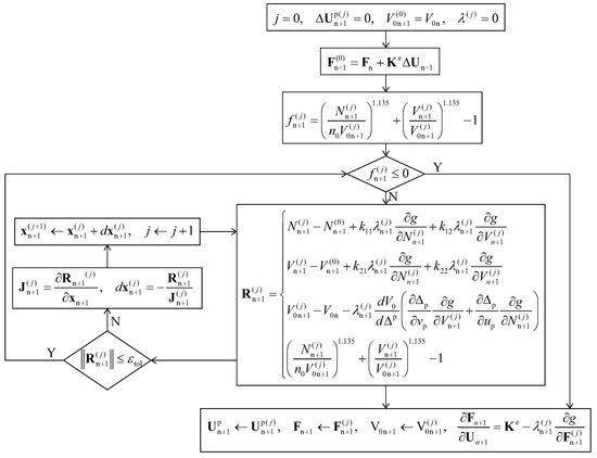 As demonstrated in Equation (23), an iterative process is needed to navigate the test load back to the yield surface. In the context of the elastoplastic model, , , and should concurrently satisfy the conditions on the updated yield surface. Consequently, alongside Equation (23), it becomes crucial to perform integration in accordance with the hardening law to derive the revised plastic state variable: