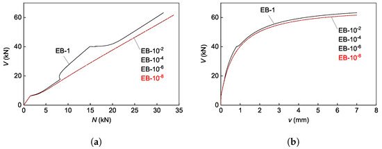 In this example involving a single macroelement, the stud’s diameter was established at 16 mm, with the concrete’s compressive strength for a cubic sample measured at 54.06 MPa. The elastic modulus for concrete was set at 35,188 MPa, and for steel, it was 206,000 MPa. The stud’s tensile strength was identified as 496.79 MPa. This numerical demonstration utilized displacement loading, where the axial and shear directions underwent proportional radial loading until reaching a predetermined displacement threshold. The analysis procedure was segmented into 1000 incremental steps, with each step approximating a 0.007 mm increment in the shear direction. Throughout the analysis, the peak incremental step number was capped at 10,000, starting with an initial step size of 0.001. The step size ranged from a minimum of to a maximum of . Various allowable error thresholds , including 1, , , , and , were employed for the calculations. The backward Euler integration method is theoretically capable of delivering precise integration outcomes, with smaller allowable errors yielding more accurate results. Consequently, a scheme adopting an allowable error of was considered to approach the exact solution most closely.