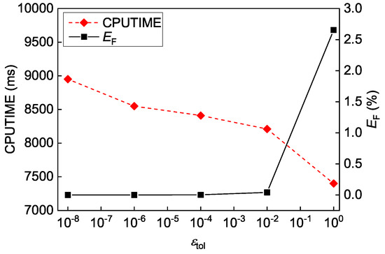 Developing a graph of CPUTIME and against as demonstrated in Figure 14 can provide a visual representation of the integration procedure’s accuracy and efficiency. One can observe that CPUTIME remains largely unvaried in response to changes in . Furthermore, the backward Euler integration method, often regarded as theoretically unconditionally stable [48,49,50], renders robust and efficient performance, even when values are minimized. This algorithm’s output leans towards convergence without being overly sensitive to predetermined assumptions. However, employing the implicit backward Euler integration within the realm of elastoplastic models necessitates that displacement increments should be maintained in comparatively small sizes to assure convergence. Additionally, executing the implicit algorithm involves greater technical complexity, and introducing kinematic hardening criteria into the elastoplastic model further escalates the numerical computation complexity.
