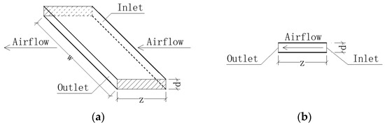 The partition wall between Chambers A and B featured a polyurethane foam core, enclosed by gypsum boards with a polyurethane coating, providing insulation against heat and moisture. A stainless-steel window was installed in the partition wall. The specialized window, rectangular in shape (0.9 m in width and 0.6 m in height), had a windowsill at a height of 0.9 m. Its crack sizes were accurately measured and adjusted. The cracks between the window and its frame were straight, consisting of two horizontal cracks and two vertical cracks. Figure 2 provides a schematic representation of the crack’s architecture. The length of the crack along the airflow, denoted by the symbol z, was set at 90 mm. The height of the crack was small, only 1 mm, represented symbolically by d, and the width of the crack was denoted by w. It was assumed that the inner face of the crack was smooth, as a study [14] showed that the penetration factor is not sensitive to crack roughness.