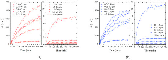 The evolution in the number concentration of size-resolved particles in Chamber B: (a) RH = 30 ± 4%; (b) RH = 85 ± 3%.