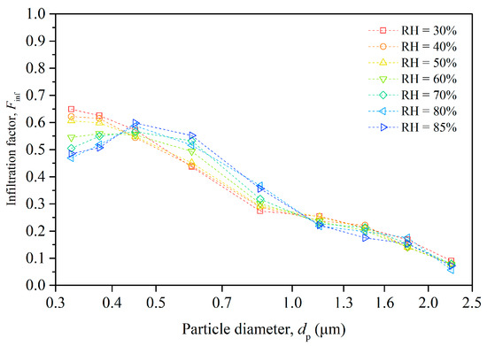 The experimental data presented in Figure 3 indicate that particle infiltration varied significantly with both indoor RH conditions and particle size. We calculated the infiltration factor for particles in different size ranges separately using Equation (2) and present the results in Figure 4.