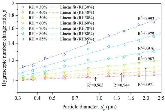 In addition to the data points, Figure 6 also portrays the linear regression for each dataset within a logarithmic coordinate system. The regression analysis revealed a linear association between the natural logarithm of β and that of the particle diameter (dp) under constant humidity. This power law relationship between β and dp aligns with the model introduced in Equation (5), suggesting potential inherent mechanisms that operated proportionally.