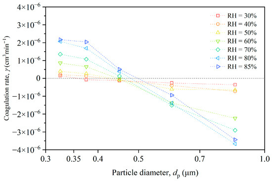 For the smallest particles (0.3–0.4 μm), the coagulation rate increased with the rising humidity, reaching a maximum at RH = 85%. This suggests that these particles were more prone to coagulate as humidity increased, possibly because water molecules on the particle surfaces enhanced the attractive forces between them. For intermediate particles (0.4–0.5 μm), the coagulation rate was negative under low humidity conditions (RH < 50%), indicating that these particles were less likely to coagulate than smaller particles. However, as humidity increased, the coagulation rate became positive, suggesting these particles became more prone to coagulation with rising humidity. For the largest particles (0.5–1.0 μm), the coagulation rate was negative across all humidity conditions, indicating that the particles in smaller-size ranges coagulated and then were counted in the larger-size ranges.