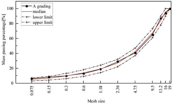 The grading of the asphalt binder mixture was AC16, and the grading screening curve is shown in Figure 1. After the gradation screening, the mass ratio of the asphalt binder was determined and the aggregate verification test was carried out (the initial mass ratio of the asphalt binder and aggregate was determined to be 4.6 based on experience, and then, four variables, 4.4, 4.5, 4.7 and 4.8, were selected by interpolation). Finally, the porosity of the specimen was measured by the surface drying method, and the calculated maximum theoretical density was used to determine the optimum mass ratio of the asphalt binder and aggregate. The optimum mass ratio of the asphalt binder and aggregate in the asphalt mixture was finally determined to be 4.5, and the design porosity was 4%. The type of coarse aggregate used in the test was limestone, the fine aggregate was mechanism sand of limestone, and the filler was mineral powder of limestone. Coarse and fine aggregates were pre-mixed for 90 s. The asphalt binder was added and the mixing was continued for 90 s. Finally, a small amount of mineral powder was added and the mixing was continued for another 90 s. The mixing temperature for the SBS-modified asphalt mixture was 180 °C. The mixing temperature for the Pen.70 virgin asphalt mixture was 160 °C. The ordinary asphalt mixture was produced. The types of asphalt mixture test samples are described in Table 4.