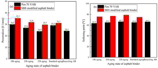 For the asphalt binder simple tray aging process, according to conversion of the rotating film oven round tray area and asphalt binder quality, the aging asphalt binder film thickness was 3.25 mm, and the aging asphalt binder film thickness was controlled to determine the quality of each tray of aging asphalt binder. The asphalt binder was aged in a forced-ventilation drying oven at a temperature of 160 °C under forced-ventilation conditions for different periods of time, such as 18, 20, 22 h, etc., and the final aging time was determined by the two indexes of the degree of penetration and the softening point, and the aged asphalt binder was stirred uniformly to carry out the subsequent tests. The needle penetration of an asphalt binder is one of the main quality indicators for evaluating asphalt binders. It can indicate the degree of asphalt softness and consistency and its ability to resist shear damage, and at the same time, it can reflect the relative viscosity of asphalt binder under certain conditions. The test error is small, and the operation is simple, so this study chose needle penetration as the evaluation index. As shown in Figure 2, taking the needle penetration as the evaluation index, the needle penetration value of the Pen.70 VAB aged for 18 h was the best match with the value after standard aging, and the needle penetration value of the SBS-modified asphalt binder aged for 20 h was the best match with the value after standard aging. And the needle penetration value of the recycled asphalt binder matched best with the 22 h aged Pen.70 VAB. Taking the softening point as the evaluation index, the softening point temperature of the Pen.70 VAB that experienced 20 h of aging best matched the standard aging. The softening point temperature of the SBS-modified asphalt binder with an aging time of 18 h best matched the value after standard aging. And the softening point temperature of the recycled asphalt binder best matched the Pen.70 VAB with an aging time of 22 h. In order to ensure the validity of the test results, it was ensured that the aged asphalt binder could reach the standard aging. It was determined that the simple pallet aging time was 20 h. In addition, it could be inferred that the recycling asphalt binder contained in the recycled asphalt pavement (RAP) used in this test was the Pen.70 VAB.