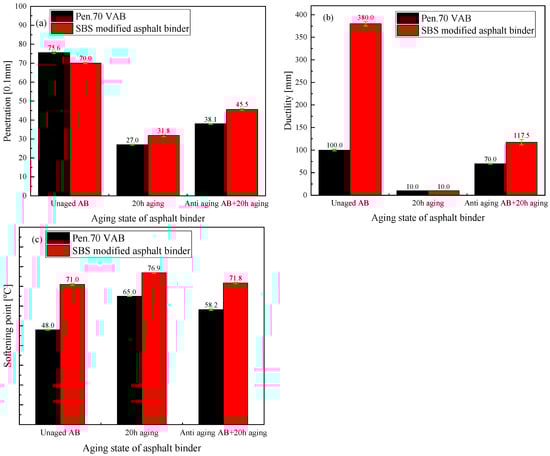 Comparative analysis of three major indexes of un-aged asphalt binder, aged asphalt binder and aged anti-aging asphalt binder. (a) Needle penetration of various asphalt binders, (b) Ductility of various asphalt binders, (c) Softening point of various asphalt binders.