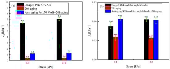 Irrecoverable flexibility (Jnr) of different types of anti-aging asphalt binders at two stress levels. (a) Irrecoverable flexibility of various Pen.70 VABs, (b) Irrecoverable flexibility of various SBS-modified asphalt binders.