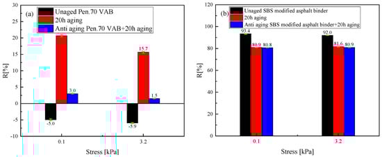 Creep recovery (R) of different types of anti-aging asphalt binders at two stress levels. (a) Creep recovery of various Pen.70 VABs, (b) Creep recovery of various SBS-modified asphalt binders.