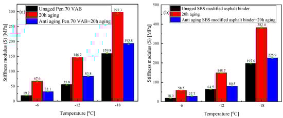Values of modulus of strength (S) for different types of anti-aging asphalt binders. (a) Stiffness modulus of various Pen.70 VABs, (b) Stiffness modulus of various SBS-modified asphalt binders.