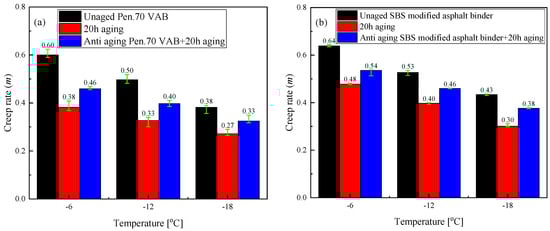 Creep rate (m values) for different types of anti-aging asphalt binders. (a) Creep rate of various Pen.70 VABs, (b) Creep rate of various SBS-modified asphalt binders.