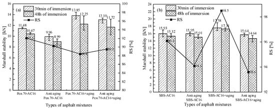 Comparison of two kinds of anti-aging asphalt mixtures in immersion water Marshall test results. (a) Various Pen.70 virgin asphalt mixtures in immersion water Marshall test, (b) Various SBS-modified asphalt mixtures in immersion water Marshall test.
