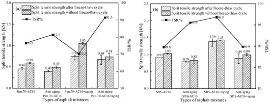 Comparison of the results of freeze–thaw splitting test of two kinds of aging-resistant asphalt mixtures. (a) Various Pen.70 virgin asphalt mixtures in the results of freeze–thaw splitting test, (b) Various SBS-modified asphalt mixtures in the results of freeze–thaw splitting test.