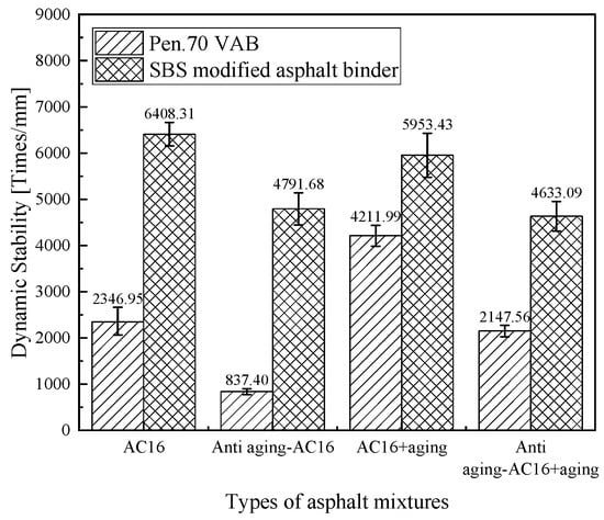 Figure 10 shows the results of the dynamic stability test before and after the aging of the Pen.70 virgin asphalt and the SBS-modified asphalt mixture with and without the anti-aging agent. The high-temperature rutting resistance of the SBS-modified asphalt mixture was larger than that of the Pen.70 virgin asphalt mixture. The dynamic stability of the asphalt mixtures increased after aging, and the high-temperature rutting resistance increased. Adding the anti-aging agent made the dynamic stability of the asphalt mixture decrease and the high-temperature rutting resistance deteriorate. In terms of high-temperature performance, the addition of the anti-aging agent into the virgin asphalt mixture had the most significant impact, and it only met the specification of the summer heat zone 1–2 technical requirements. If an anti-aging agent is applied to improve a VAB, in order to ensure that the high-temperature rutting resistance of the anti-aging asphalt mixture meets the specification requirements, the recommended anti-aging agent dosage should be reduced; the specific dosage needs to be further studied.
