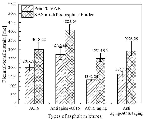 As can be seen from Figure 11, after the aging of the asphalt mixtures, the bending and tensile strain decreased, and the low-temperature crack resistance performance decreased. Adding an anti-aging agent can delay the aging of an asphalt mixture and improve the bending and tensile strain of an asphalt mixture; that is, it can improve the low-temperature cracking resistance of an asphalt mixture. Here, the addition of the anti-aging agent could improve the low-temperature aging performance of the asphalt mixture by 16%. The low-temperature performance of the SBS-modified asphalt mixtures was much higher than that of the Pen.70 virgin asphalt mixture for the same gradation.