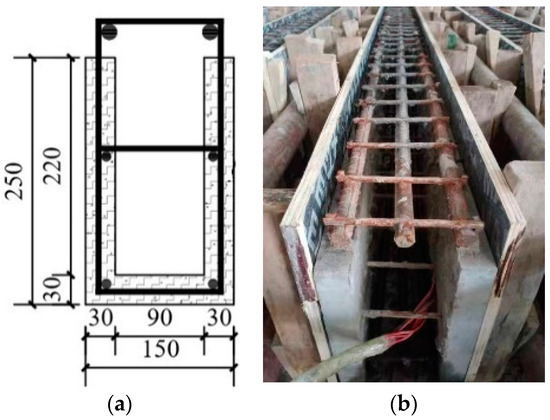 Diagram of the specimen manufacturing process: (a) shell cross−sectional dimensions; (b) the prefabricated shell.