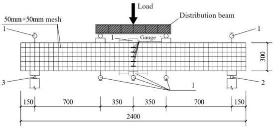 One displacement sensor was arranged at the top and bottom of the beam along the beam’s length to monitor the beam section’s rotation. Three displacement sensors were arranged at the middle of the beam span and the loading point position to monitor the vertical displacement. Strain gauges were arranged along the beam height direction to monitor the ECC or concrete strain. The longitudinal and transverse reinforcement strain was monitored through gauges on the reinforcement bars in the beam.