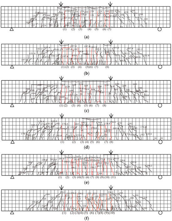 Crack distributions in the specimens: (a) PSMCB-1; (b) PSMCB-2; (c) PSMCB-3; (d) PSMCB-4; (e) PSMCB-5; (f) PSMCB-6.