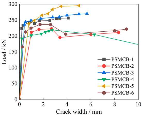 According to the values measured by the crack width detector during the test, the curves of the maximum crack width relative to the load were plotted, as shown in Figure 7.