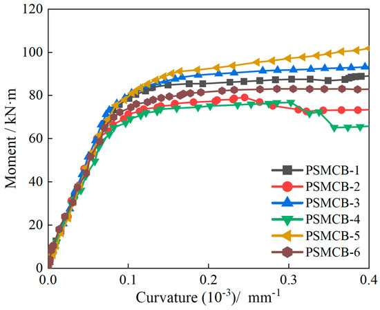 Figure 9 shows the moment–curvature curves for the specimens. The overall trend is similar to that of the force–displacement curves. Before cracks appeared, the bending moment was linearly related to the curvature. When cracks appeared, the bending moment was no longer linear with the curvature. The cross−sectional curvature and the deflection increased rapidly. Under the same bending moment, the curvature of the ECC composite beam PSMCB-1 was relatively small among the two composite beams PSMCB-1 and PSMCB-6. When the curvature of specimens PSMCB-1 and PSMCB-6 was 0.0001, the corresponding moments of the specimens were 78.7 kN and 72.3 kN. The bending moment value of specimen PSMCB-1 was relatively higher. There was also no load decrease for specimen PSMCB-1 when the test stopped. In comparison, the moment of beam PSMCB-6 showed a decreasing trend.