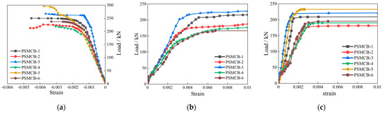 - For specimens PSMCB-1 and PSMCB-6, with different materials in their prefabricated shells, the reinforcement strain was small in the early stage, and the composite beams’ load–reinforcement strain curves were almost the same. For the RC composite beam (PSMCB-6), when the cracks appeared, the concrete in the crack section directly withdrew from the work, and the reinforcement stress increased suddenly. Thus, there was a sharp increase in the reinforcement strain. For specimen PSMCB-1, the reinforcement bar strain continued to grow without abrupt changes due to the presence of the ECC material. Compared with that of specimen PSMCB-6, the curve slope of the ECC composite beam PSMCB-1 was relatively larger, and the bending bearing capacity was also higher. The load–reinforcement strain curve tended to be smoother more slowly. Under the same load level, the reinforcement strain of specimen PSMCB-1 was relatively smaller among the two composite beams PSMCB-1 and PSMCB-6. In Figure 10b, when the load reached 83.8 kN, the reinforcement bar strain in the prefabricated shell of specimen PSMCB-6 was about 0.002, which was close to yielding, while the strain of specimen PSMCB-1 was only 0.0013. When the reinforcement bar strain of specimen PSMCB-1 reached 0.002, the corresponding load was 114.2 kN. In Figure 10c, when the load reached 146.2 kN, the reinforcement bar strain in the post-poured concrete of specimen PSMCB-6 was about 0.002, while the strain of specimen PSMCB-1 was about 0.0012. When the reinforcement bar strain of specimen PSMCB-1 reached 0.002, the corresponding load reached 207.3 kN. For the reinforcement bars under compression, as shown in Figure 10a, when the reinforcement bar strain reached −0.002, the corresponding load of PSMCB-1 was 243.6 kN, and the corresponding load of PSMCB-6 was 228.4 kN. In Figure 10b, the curves of the reinforcement bars in the prefabricated shells of specimens PSMCB-4 and PSMCB-6 were similar, although the amount of reinforcement in the beam PSMCB-4 was less than that in the beam PSMCB-6. This was mainly because the ECC material underwent multi-crack steady-state propagation under direct tension, showing tensile hardening characteristics. Using ECC material in the prefabricated shell could effectively delay not only the yielding of the longitudinal reinforcement bars but also the yielding of the reinforcement bars in the post-poured concrete. The overall mechanical performance of the beam was improved.