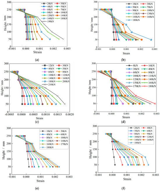 Cross−sectional strain along the beam height: (a) PSMCB-1; (b) PSMCB-2; (c) PSMCB-3; (d) PSMCB-4; (e) PSMCB-5; (f) PSMCB-6.