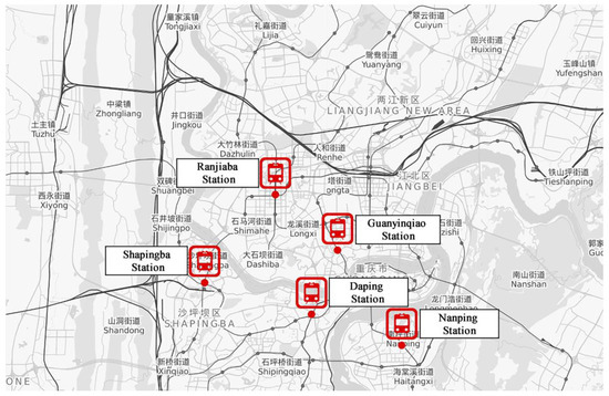The cluster-based urban structure in Chongqing creates a significant opportunity for the development of transfer stations, with various-sized regional commercial hubs emerging around the central metro transfer stations in each cluster. This setup draws on a unique combination of “urban characteristics + transportation features” associated with metro transit stations. For the purpose of this study, five stations have been chosen for in-depth analysis: Guanyinqiao Station in the Jiangbei District, Ranjiaba Station in the Yubei District, Daping Station in the Yuzhong District, Shapingba Station in the Shapingba District, and Nanping Station in the Nan’an District (Figure 1).