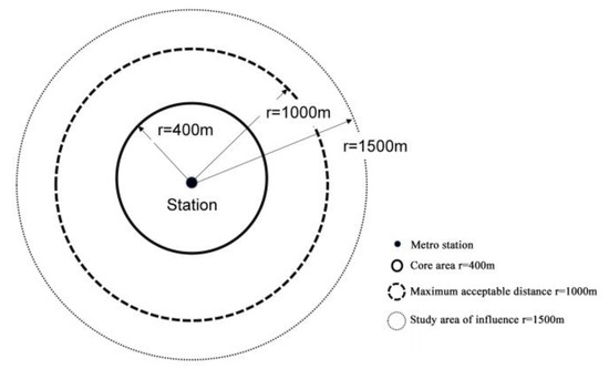 TOD theory suggests that the vicinity of metro stations should be organized with these stations as the central area, forming a layered structure in space that is within walking distance of 400~800 m, or walking time of 5~10 min [3,41,42,43,44]. However, changes in related environmental factors suggest the necessity to extend the analysis beyond the immediate scope of study. Accordingly, this research extends the area of influence for metro stations to 1500 m, while confining the discussion to a maximum acceptable distance of 1000 m. With respect to individual factors, the focus is confined to within 400 m of the central area (Figure 2).