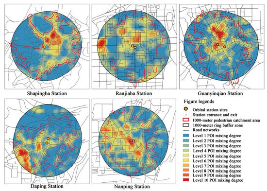 With respect to the pedestrian catchment area ratio, we observe a spectrum ranging from the lowest to the largest, the stations are Daping Station (48.27%), Shapingba Station (53.28%), Nanping Station (61.34%), Ranjiaba Station (66.10%), and Guanyinqiao Station (66.32%).