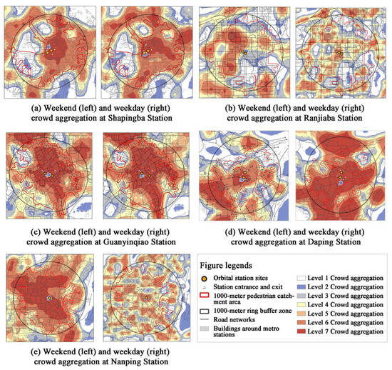 Considering the emphasis on pedestrian behavior in metro transit stations areas, understanding the motivations driving pedestrian traffic—particularly commercial and transfer-related activities—is crucial for maximizing the economic and environmental benefits of station area development. Comparing pedestrian congregation patterns on weekends and weekdays offers valuable insights into a station’s ability to attract crowds and the underlying motivations for pedestrian visits (Figure 6).
