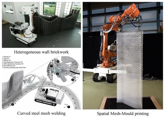 - Dörfler, K.; Hack, N.; Sandy, T.; Giftthaler, M.; Lussi, M.; Walzer, A.N.; Buchli, J.; Gramazio, F.; Kohler, M. Mobile robotic fabrication beyond factory conditions: Case study Mesh Mould wall of the DFAB HOUSE. Constr. Robot. 2019, 3, 53–67. [Google Scholar] [CrossRef]