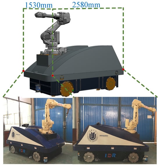 In this paper, a mobile construction robot prototype for the installation of construction panels, equipped with Mecanum wheels and ABB IRB2600 industrial robot, is introduced. As shown in Figure 2, our design utilizes Mecanum wheels to facilitate omnidirectional movements, and the robot arm is used to complete the final construction tasks. In previous work, we have addressed the issue of base planning for mobile construction robots in a large-scale construction environment []. This paper focuses on a newly developed localization for on-site building construction, which employs onboard laser sensors, combined with trilateral positioning and EKF, to facilitate the on-site positioning of mobile construction robots. Our primary goal is independent and reliable localization in semi-open and chaotic environmental conditions. In summary, the main contributions of this paper are as follows: