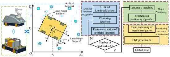 As shown in Figure 3, artificial landmark features are extracted under the robot coordinate system. The coordinates of landmarks are then converted to the global coordinate system, and a trilateral positioning algorithm is used to calculate the robot’s pose in a global coordinate system. The robot positioning accuracy is improved with the fusion of odometer data using an extended Kalman filter, the mobile unit is simplified to the global coordinate system, and the positioning system is divided into three components: artificial landmark recognition, position using the optimal trilateral algorithm, and accuracy improvement based on EKF.