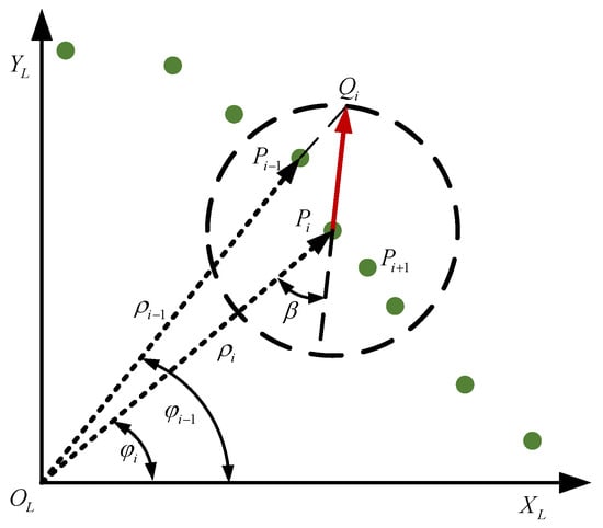 Therein, , , and are adjacent laser points; is the distance between and , while is the intersection point of the line and the circle (supplementary details are shown in Figure 4; is the angle between ; and , and is the laser measurement error.
