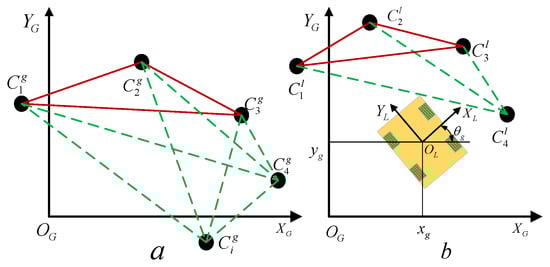 Trilateral positioning can only be used when three or more artificial landmarks are detected; this condition is key to the localization of the mobile construction robot and can be described. Assume h reflectors are arranged in the global environment as shown in Figure 5a. The position of the reflector in the global coordinate system is represented as and any three reflectors can be selected to form a triangle with denoting the center. The segments , , and the angle shown in Figure 5b can be calculated as: