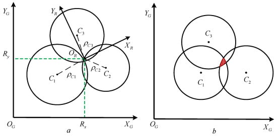 It is assumed that the robot can observe three reflective columns with coordinates of , , and at any given time as shown in Figure 6a. The distance from the laser sensor to the center of the reflector can be used to define the radius of a circle. These circles will intersect at a point, which defines the global pose of the robot. However, due to measurement errors in the laser sensor, this intersection will span a finite region as shown in Figure 6b. The geometric relationship shown in Figure 6a produces the following set of equations: