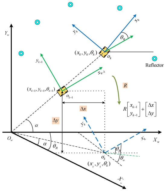 The observation model based on artificial landmark positioning requires calculating the relationship between pose changes at adjacent times. As shown in Figure 8, represents the robot pose measured by laser and calculated using a trilateral positioning algorithm, while represents the pose predicted by laser measurements based on a motion model with included errors. The offset angle of the predicted pose relative to the real pose is denoted . After a rotation transformation R, the predicted pose in the global coordinate system can be expressed as: